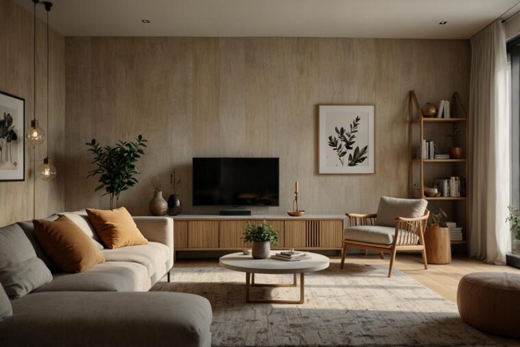Das Zusammenspiel von Sandtönen und skandinavischem Design sorgt für ein harmonisches Wohnzimmer, das Ruhe ausstrahlt und dennoch modern wirkt – ideal für entspannte Stunden und geselliges Beisammensein.