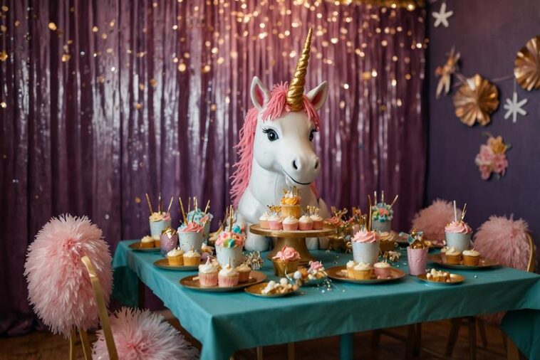 Eine Einhorn-Kinoecke ist eine zauberhafte Ergänzung für jede fantasievolle Einhornparty. In einem abgetrennten Bereich, idealerweise mit bunten Vorhängen oder Dekorationen, können die kleinen Gäste gemeinsam Einhorn-Filme schauen und in eine magische Welt eintauchen. Beliebte Filme wie „My Little Pony“ oder andere kindgerechte Fantasy-Filme verleihen dem Event eine märchenhafte Atmosphäre. Um den Komfort zu erhöhen und die Gemütlichkeit zu fördern, sollten weiche Kuscheldecken und Sitzkissen bereitgestellt werden. Diese schaffen eine einladende und warme Umgebung, in der sich die Kinder entspannen können. Auch ein paar Einhorn-Plüschtiere oder kleine Deko-Elemente, wie glitzernde Sterne und bonbonfarbene Lampen, runden das Erlebnis ab. So wird die Kinoecke zu einem Highlight jeder Einhornparty und bietet nicht nur Unterhaltung, sondern auch einen Rückzugsort für die Kinder inmitten der Feierlichkeiten. Die Kombination aus leuchtenden Farben, fantasievollen Motiven und bequemen Sitzgelegenheiten macht diesen Bereich besonders attraktiv und sorgt für strahlende Kinderaugen.